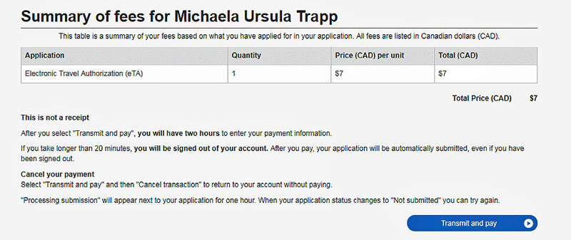 - Zahle die Gebühr von 7 CAD für die eTA nach Ausfüllen des Antragformulars.