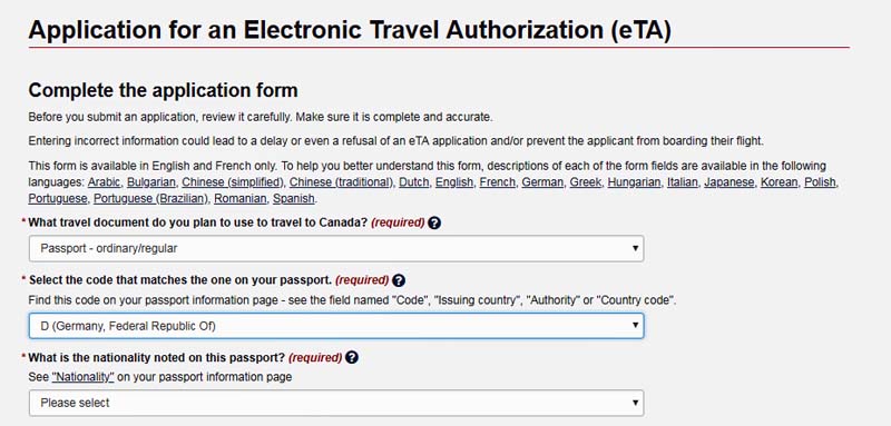 Diese Seite enthält Hinweise, dass du alles akkurat und gewissenhaft ausfüllen sollst keine falschen Angaben machen darfst. Du kannst außerdem auswählen, mit welcher Art von Dokument du beabsichtigst, nach Kanada einzureisen. Im Normalfall ist für eine Urlaubsreise dazu ein ganz normaler Reisepass (Passport ordinary/regular) notwendig. Hast du diesen Punkt ausgewählt, musst du das Land angeben, in dem dein Reisepass ausgestellt wurde (beispielsweise D für Deutschland). Anschließend gibst du deine Nationalität ein (Germany, Federal Republic of), wenn du die deutsche Staatsbürgerschaft hast. Es folgen: