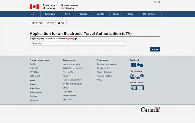 Wir beginnen auf der Homepage des Gouverment of Canada, der offiziellen und einzigen Seite zur Beantragung der eTA. Die Seite ist mit der Überschrift betitelt: