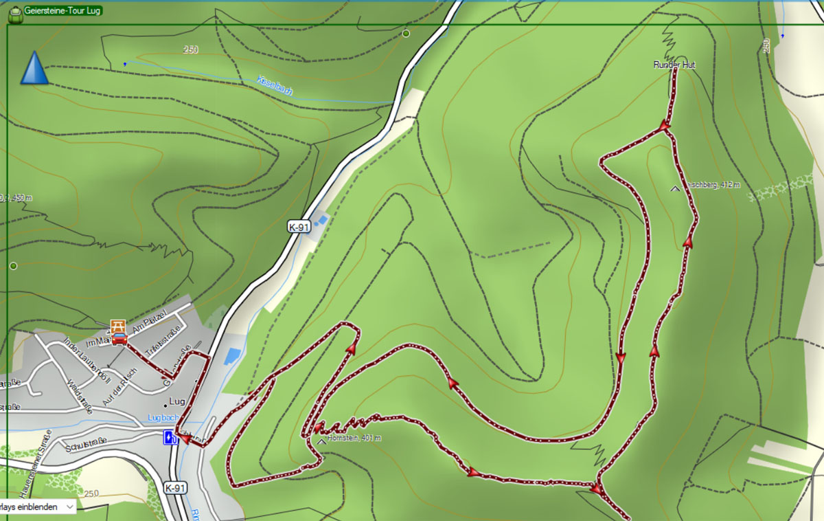- Start/Ziel: Wanderparkplatz an der PWV-Hütte, Im Maisfeld, Lug