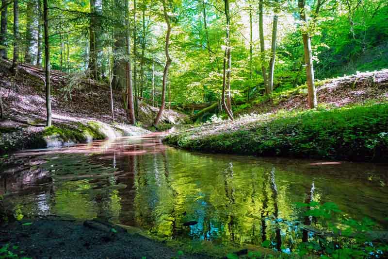 Sieht man einmal von der nahen Autobahn ab, die immer eine gewisse Geräuschkulisse produziert, ist die Wanderung durch die Röthenbachklamm bei Altdorf recht urig. In den seltenen Fällen, in denen der Röthenbach einmal Hochwasser führt, ist der Weg in Teilen nicht begehbar. Nehmt auf jeden Fall lieber ein Handtuch mit, falls ihr barfuß durch den Rumpelbach waten müsst. Und zieht unbedingt auch robuste Schuhe an. Mit dem Kinderwagen kommt ihr leider nicht sehr weit, für Kinder ab etwa 5 Jahren ist der Weg allerdings ein Heidenspaß.