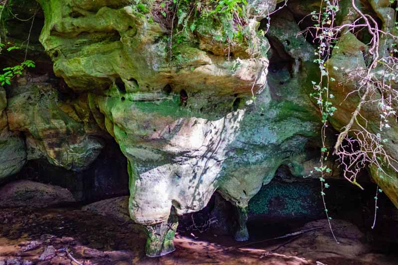 Dieses Phänomen sieht man auch in der Rumpelbachschlucht recht eindrucksvoll. Von oben ist der Sandstein gut durch eine Schicht anderen Materials abgedeckt, sodass von hier aus keine Erosion stattfindet. Dort, wo der Röthenbach auf den Sandstein trifft, holt er langsam aber sicher die kleinen Körner aus dem Sandstein heraus und wäscht ihn damit aus.