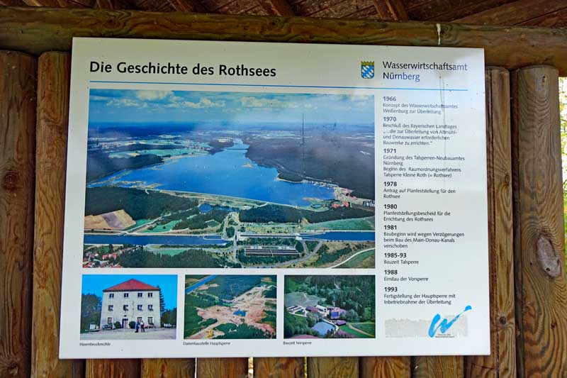 Wir beginnen unsere Rundwanderung um das Gewässer im Fränkischen Seenland auf dem Parkplatz direkt an der Vorsperre am Ostufer des Rothsees. Gleich nach ein paar Metern liegt rechts ein kleiner Hügel mit dem Aussichtspunkt. Überall um den See herum liefern zahlreiche Tafeln Informationen über den Stausee selbst sowie seine natürliche Flora und Fauna.