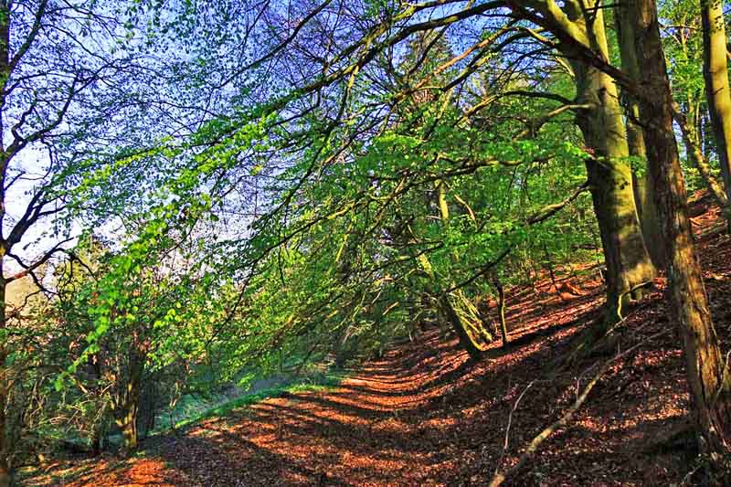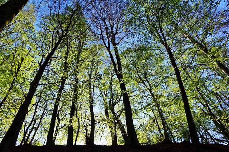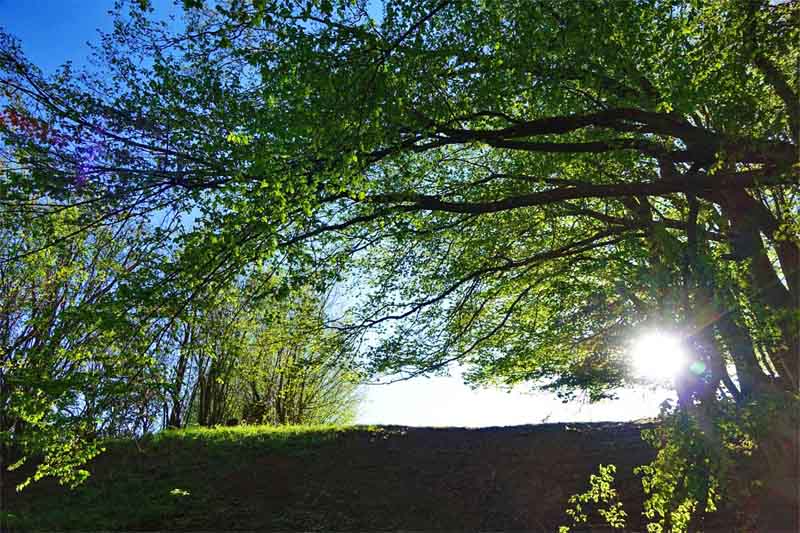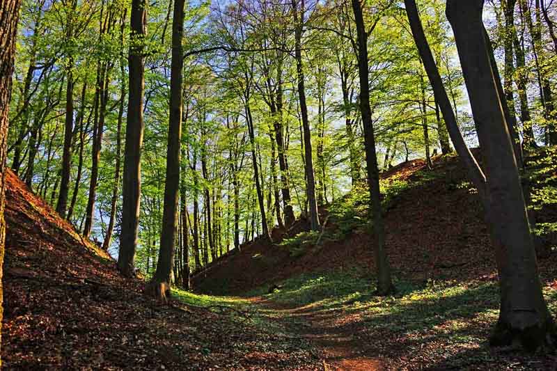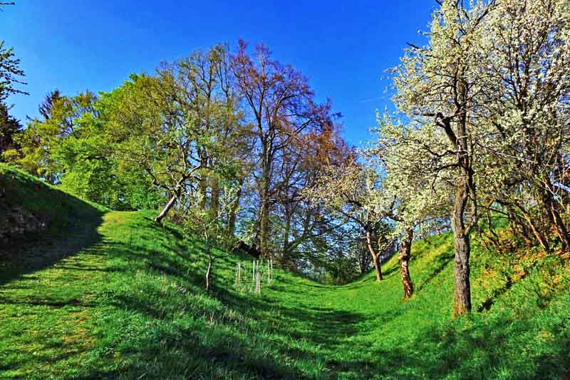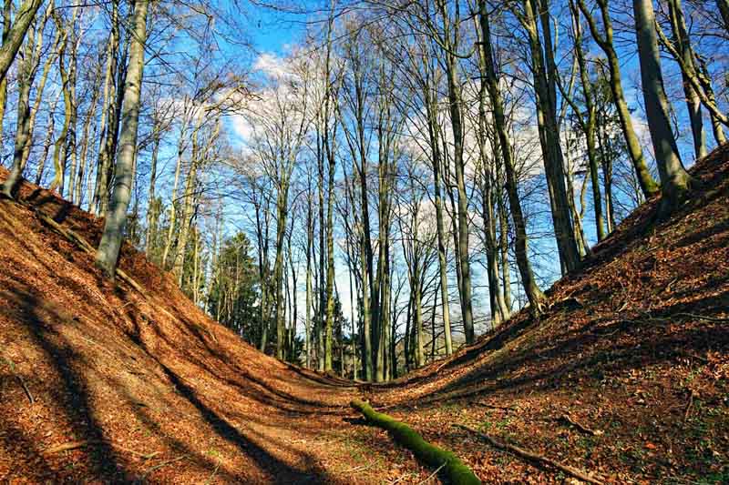 Manchmal muss man gar nicht weit raus, um einen herrlichen Tag auf einer Wanderung zu verbringen. Und oft sind es die wenig bekannten, scheinbar unspektakulären Touren, die es besonders in sich haben. Das gilt auch für den Rundwanderweg Schlossberg bei Heideck. Allein der Streckenabschnitt durch den alten Burggraben, von dem heute nichts mehr zu erkennen ist, lässt das Herz höherschlagen. Wenn man nach oben blickt, ragen hoch über unseren Köpfen die Kronen alter Buchen in den Himmel, die sich mit einem sanften Rauschen im Wind hin und her wiegen. Ich ertappe mich dabei, gleich ganz unbewusst einen tiefen Atemzug der Waldluft in mich einzusaugen. Er ist zweifellos entspannend und doch auf seine ganz eigene Art faszinierend.