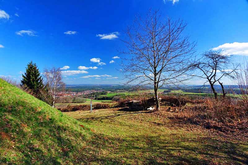 Nach einigen Hundert Metern verlasst ihr den Forstweg wieder nach links steil bergauf. Dort, wo ihr oben aus dem Wald kommt, liegt ein Pavillon oben auf dem Schlossberg mit Aussicht bis zum Brombachsee – nebst uriger Picknickstelle. Weiter geht es an der Hochfläche am Waldrand entlang nach Osten. Nach dem Funkturm führt ein schmaler Weg durch den tiefen Burggraben zurück zur ehemaligen Burg und dem Parkplatz an der Kirche.