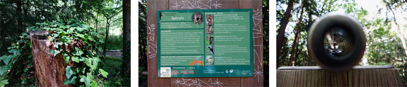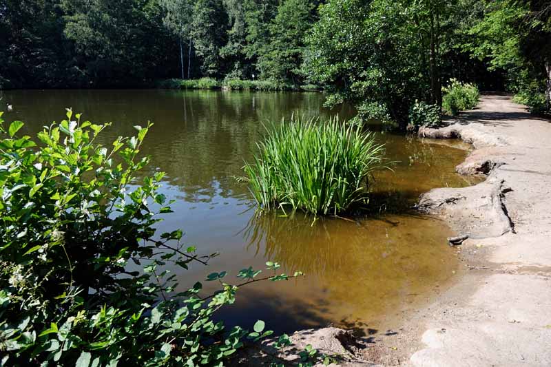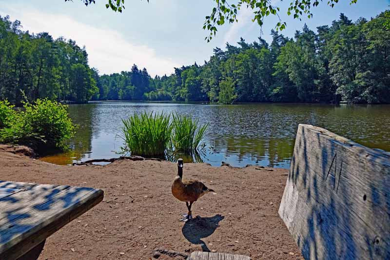 Vor diesem biegen wir nach links ab, gehen am Ufer entlang bis zum Ende des Eisweiers und biegen dann auf den Forstweg nach links. Es geht durch den Lorenzer Reichswald, vorbei am Holzweiher auf der linken Seite, rechts befindet sich dort die Infotafel zum ehemaligen Straflager. Wir durchwandern das Feuchtgebiet mit dem Erlenbruchwald und kommen, wenn wir uns immer leicht links halten, am Spielplatz am Inselrestaurant Valnzerweiher wieder aus.