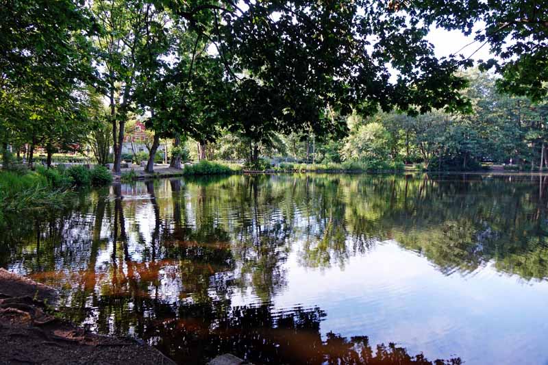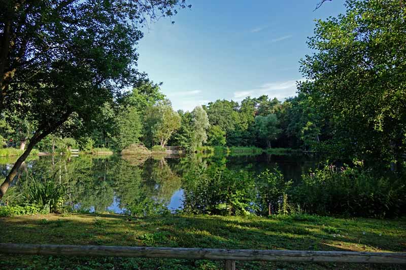 An der Kreuzung biegen wir nach links ab, umrunden den kleineren Weiher rechts herum und kommen schließlich wieder an der Valznerweiherstraße an, von der wir gestartet sind.