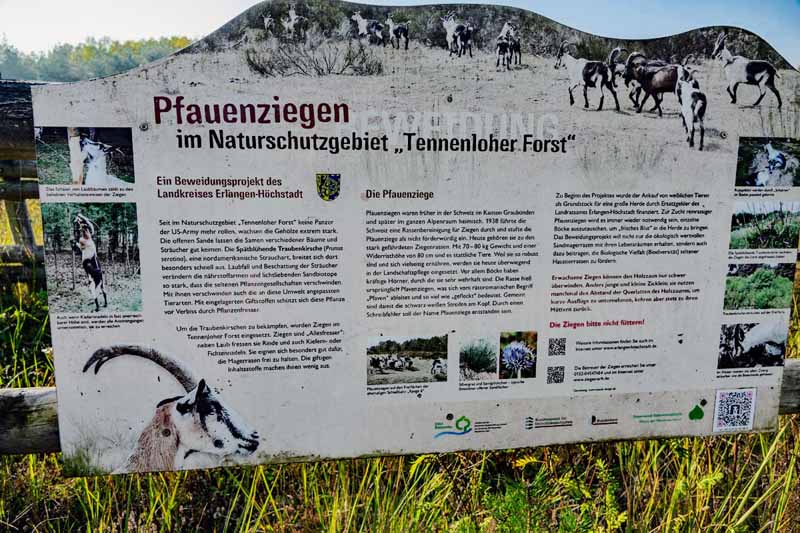Zwar haben sich die Urwildpferde wohl alle Mühe gegeben, die Sandflächen von Bäumen und Sträuchern freizuhalten, trotzdem breitete sich vor allem die Traubenkirsche immer mehr auf dem ehemaligen Truppenübungsplatz im Tennenloher Forst aus. Deshalb kommen ihnen seit dem Jahr 2012 Pfauenziegen zur Hilfe. Pfauenziegen sind im schweizerischen Kanton Graubünden heimisch und gehören zu den heute bedrohten Ziegenrassen.