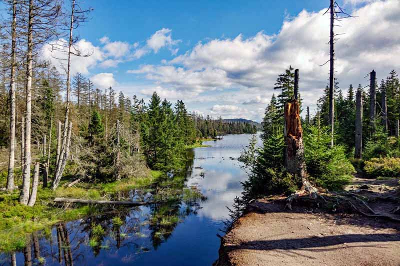 Waldstücke, die gerade abgestorben sind, wechseln auf dem Rundweg um den Moorsee mit einem jungen Wald aus Fichten und Ebereschen ab. Der Wald erneuert sich rasant. Und das alles in kürzester Zeit und ohne jegliches Dazutun des Menschen. Inzwischen sind die Bäume am Oderteich schon wieder mehrere Meter hoch gewachsen und weitere stehen in den Startlöchern.