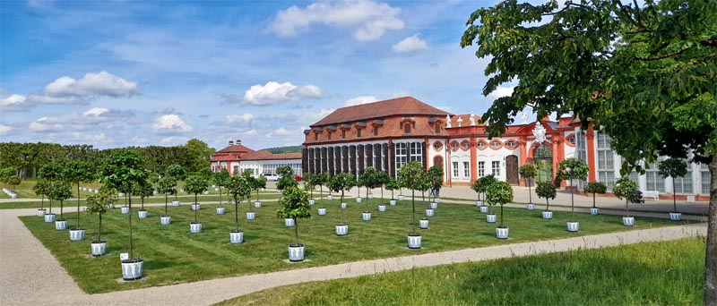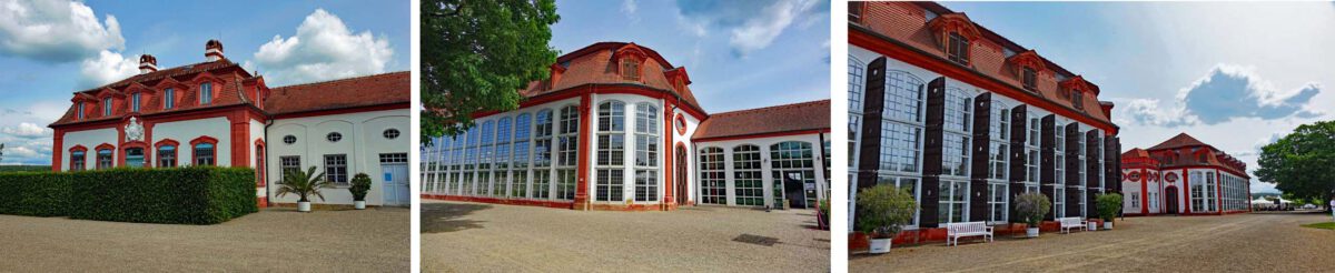 Nach Plänen von Baltasar Neumann wurde ab 1733 eine Orangerie an der Nordflanke in die Anlage integriert. Damals war es üblich, etliche Sorten an Orangenbäumen und andere exotische Gewächse in einem Schlossgarten zu ziehen. Und weil diese Exoten, und wenn sie auch nur aus dem Mittelmeerraum stammten, kälteempfindlich waren, mussten sie einen Überwinterungsplatz bekommen. Ein Gewächshaus oder Wintergarten. Eine Orangerie eben.