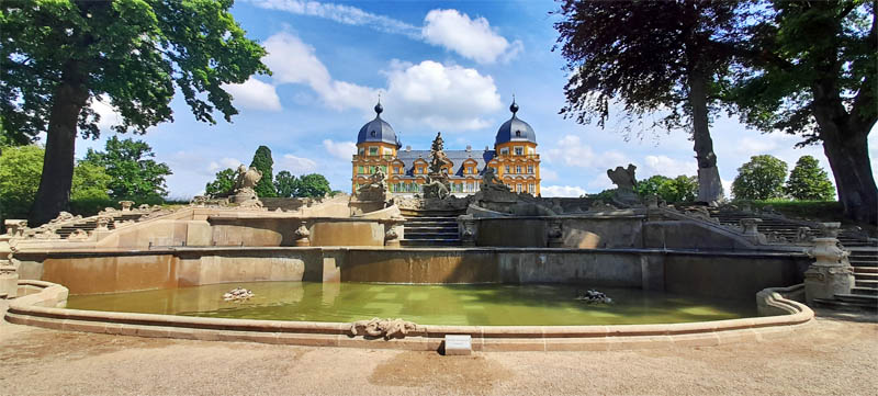 Als der Freistaat Bayern dann im Jahr 1975 das Schloss und seinen Park erwarb, befand sich die Kaskade in einem bemitleidenswerten Zustand. Die Steinstufen waren zerbrochen, der Sandstein verwittert und durch Frost abgesprengt und die Stützmauern abgesackt. Wenn man ehrlich ist, war alles nur noch ein einziges Trümmerfeld. Und so dauerte es auch seine Zeit, bis man in aufwendigen Recherchen und archäologischen Grabungen herausfand, wie die Wasserspiele ursprünglich einmal ausgesehen hatten.