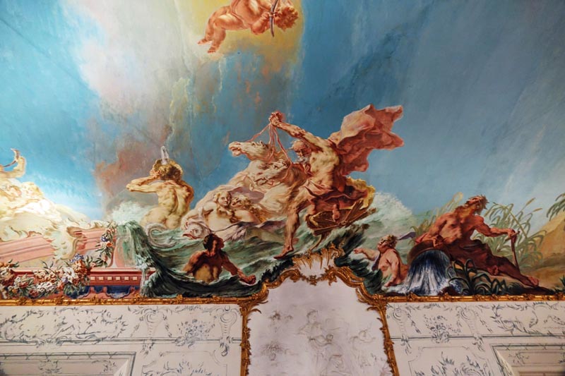 Dargestellt ist ein auf die fürstbischöfliche Sommerresidenz bezogener Götterhimmel. Auf der Eingangsseite die Neptungruppe mit dem Flussgott Nil, gegenüber am Fenster prangen Diana, Pan und ein paar Nymphen. Bacchus und Amor dürfen natürlich auch nicht fehlen. Die Putten im Rahmen verkörpern die vier Jahreszeiten. An den Wänden Themen aus der Musik, der Jagd oder auch der Fischerei.