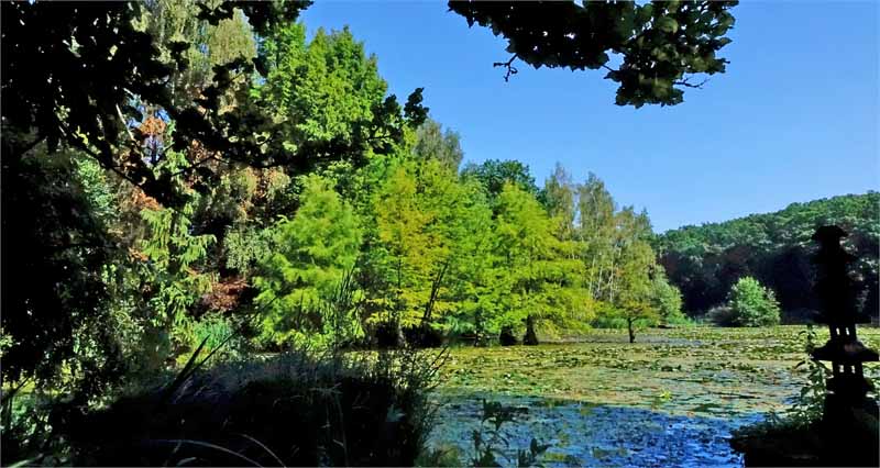 Im September ist es natürlich etwas zu spät, um die atemberaubende Rhododendronblüte zu bestaunen. Trotzdem büßt die Anlage nichts von ihrem verträumten Charme ein. Immer wieder tauchen im Zwielicht der Bäume kleine Brücken und andere asiatische Elemente auf, die dem Park ein ganz besonderes Ambiente verleihen.