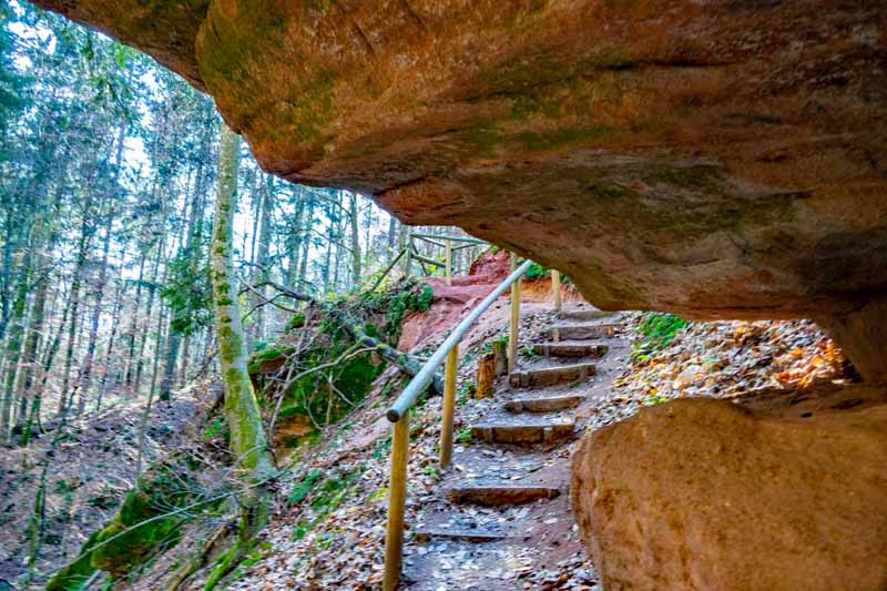 Wir folgen der Beschilderung und erreichen nach kurzer Strecke durch den Wald die Stufen hinauf zur Schlucht Schnittlinger Loch. Direkt nach den Burgsandsteinfelsen geht es links die Stufen hinauf (Achtung, kann leicht übersehen werden). Oben erreichen wir wieder den Parkplatz.