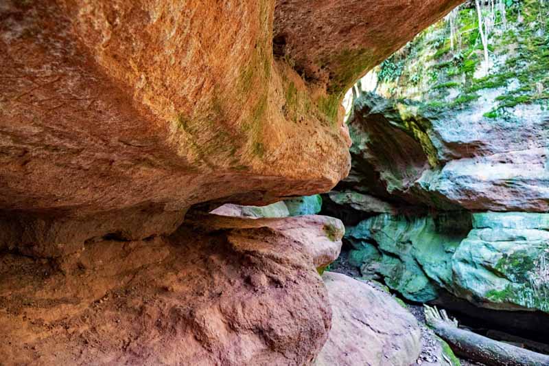 Über 15 Meter ragen die bizarren Felsformationen in den Himmel auf einer Länge von rund 50 Metern. In den Felsen sind unzählige kleine Höhlen und Unterwaschungen zu finden. Wer genauer hinsieht, kann auch die unterschiedlichen Sedimentstrukturen erkennen. Inzwischen sind große Teile des grobkörnigen Sandsteins mit einer dicken Schicht Moos überzogen, die vor allem in den Frühlings- und Herbstmonaten zu leuchten scheinen.