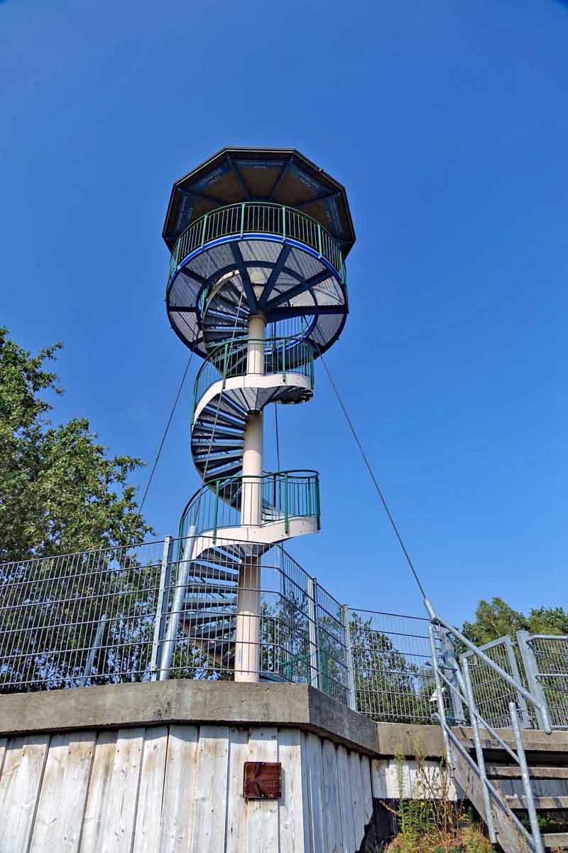 Die gute Sicht bis nach Berlin ergibt sich nicht nur aus der Höhe des Turms. Auch sein Standort ist mit Bedacht ausgewählt. Er steht nämlich auf der höchsten Erhebung der Döberitzer Heide, etwa 85 Meter über dem Meeresspiegel. Auf der Deckenplatte des vor rund 75 Jahren gebauten Bunkers ist dieser Aussichtsturm errichtet worden. Und mit etwas Glück erhascht ihr von hier oben aus auch einen Blick auf eine der Wisent-Gruppen.