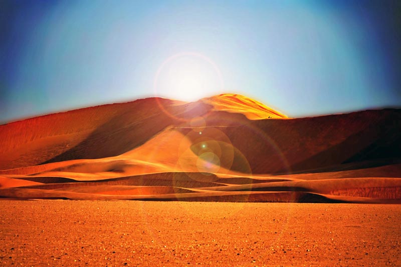 Die älteste Wüste der Erde mit ihrem roten Sand und den legendären roten Dünen beherrscht die gesamte Küstenlandschaft Namibias zwischen Lüderitz im Süden und dem Kuiseb Canyon im Norden. Die Salzpfanne des Sossusvleis liegt zentral im Namib-Naukluft-Park in der Zentralnamib.