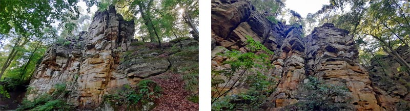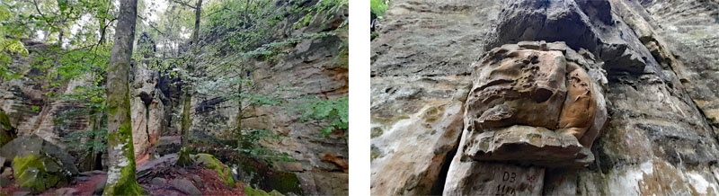 Ab hier öffnet sich die Schlucht, auf der linken Seite türmen sich bizarre Felswände in die Höhe. Wir gehen an einer Infotafel über die Schlucht vorbei und folgen dem Weg immer weiter durch die urtümliche Felsenlandschaft. Die Schlucht zieht sich scheinbar endlos durch den Wald, überall tauchen wieder neue bizarre Felsformationen auf, mal steil und glatt, mal stark zerklüftet.