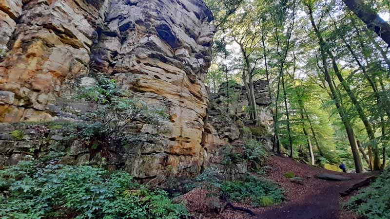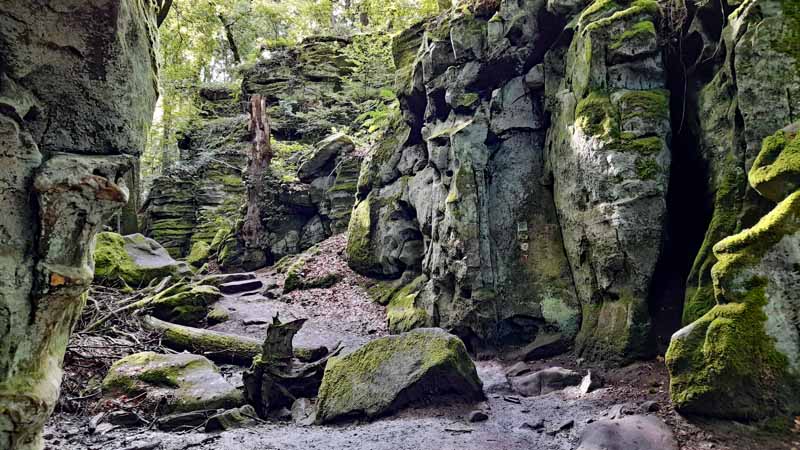 Hinter der Kurve biegen wir nach links ab und haben die schlimmste Steigung hinter uns gebracht. Ab hier geht es auf etwa gleicher Höhe über den unwegsamen Trampelpfad weiter durch den Wald. Auf der rechten Seite treffen wir auf die ersten Felsmassive, die sich über den gesamten Hang ziehen. In einem davon befindet sich die Keltenhöhle, deren Eingang am Wegesrand liegt. Auch hinter der Keltenhöhle geht es über Stock und Stein sowie die eine oder andere Treppenstufe weiter. Nach insgesamt etwa 1,2 km am Hang entlang trifft der naturnahe Weg auf eine T-Kreuzung.