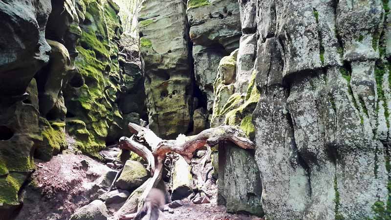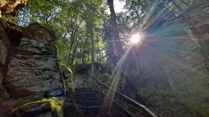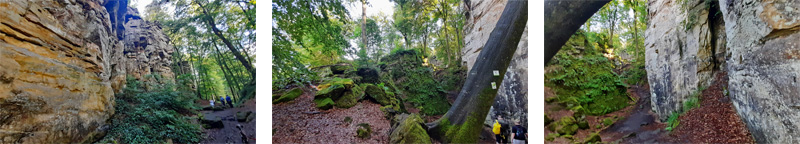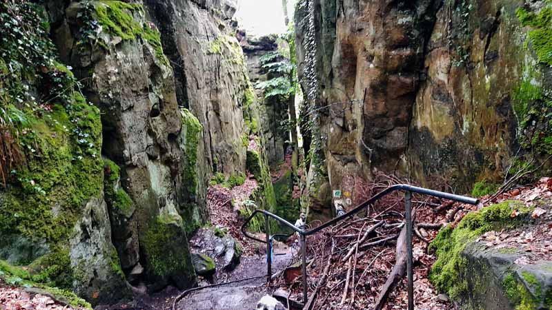 Um uns herum uns erheben sich die engen Steilwände der Sandsteinschlucht, die zum Teil mit Moos überzogen sind. Von hier aus geht es nach schräg links weiter. Wir folgen dem Verlauf des Weges durch die Felswände. Hinter einem nur etwa hüfthohen Durchschlupf führt uns der Weg über einen Holzsteg weiter und über weitere Stufen hinab.