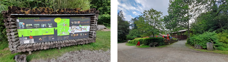 Auf der rechten Seite stehen am Eingang zum Dinosaurierpark zwei große Dinosaurier, die wir auf dem Hauptweg geradeaus passieren. Nur ein kurzes Stück weiter liegt links zunächst das Honiglädchen, in dem alle möglichen Produkte rund um Honig und Bienen verkauft werden. Dahinter treffen wir auf das Naturparkzentrum Teufelsschlucht. Auf der gegenüberliegenden Seite führt nach rechts ein breiter Forstweg ab, dessen Verlauf wir etwa 400 m folgen. Ab hier befinden wir uns auf der Markierung Großer Rundweg Teufelsschlucht (rotes T mit Hörnern auf weißem Grund).