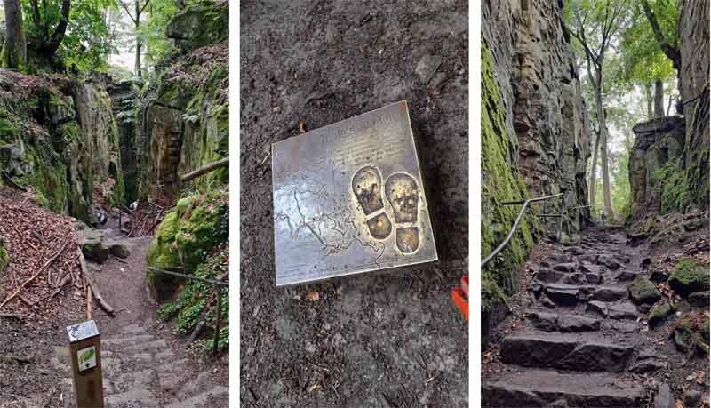 Ein Wegweiser zeigt nach links an einer Metalltafel mit zwei Schuhabdrücken und der Wegführung durch die Schlucht vorbei. Der Eingang in die Teufelsschlucht erfolgt über einige schiefe Stufen nach. (Vorsicht, bei feuchter Witterung rutschig! Handlauf vorhanden)
