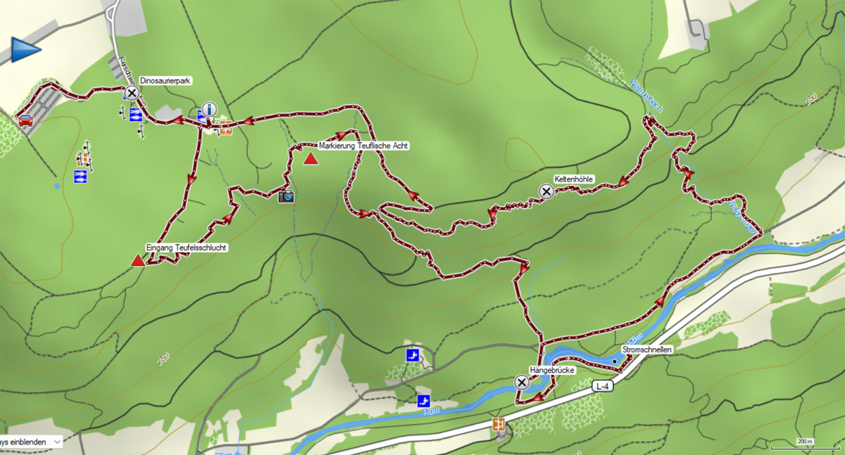 Wanderparkplatz >>> Dinosaurierpark >>> Naturparkzentrum >>> Teufelsschlucht >>> Irreler Hängebrücke >>> Stromschnellen >>> Keltenhöhle >>> Wanderparkplatz