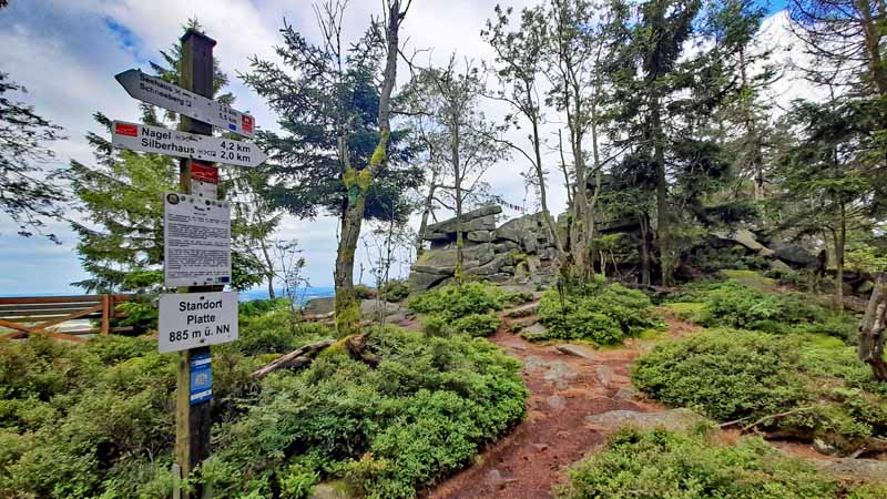 Auf der anderen Seite der B303 erhebt sich ein weiteres Bergmassiv empor. Der Gipfel der Platte ist sicherlich nicht der höchste hier im Fichtelgebirge – und außerdem hebt er sich auch kaum vom Bergrücken ab. Das mit Abstand Bemerkenswerteste am Plattengipfel ist das gigantische Blockmeer auf der Ostseite. Oben auf dem Grat angekommen, schweift das Auge über riesige Felder nahezu vegetationsfreier Granitblöcke und -platten. Lediglich Moose und Flechten verleihen den grauen Monstern einen Hauch von Grün.