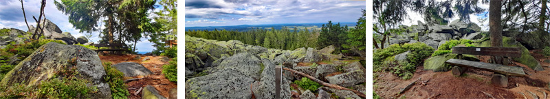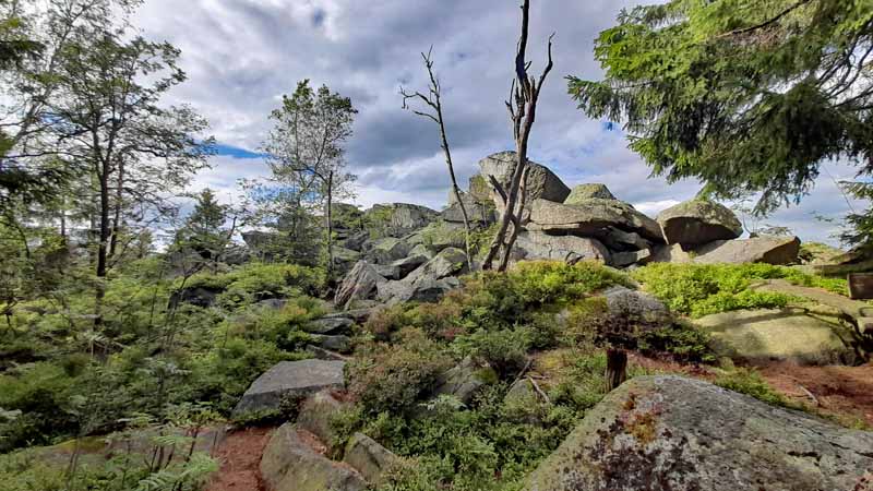 Der Anblick ist atemberaubend. Solche Blockhalden sind hier im Fichtelgebirge nicht selten, auch am Haberstein gibt es eine solches Felsenmeer an der Flanke unter dem Gipfelbereich. Wer noch höher hinauf zum Gipfelkreuz möchte, kann über die in den Felsen geschlagene Treppe zum Aussichtspunkt steigen, um dort eine kleine Rast einzulegen.