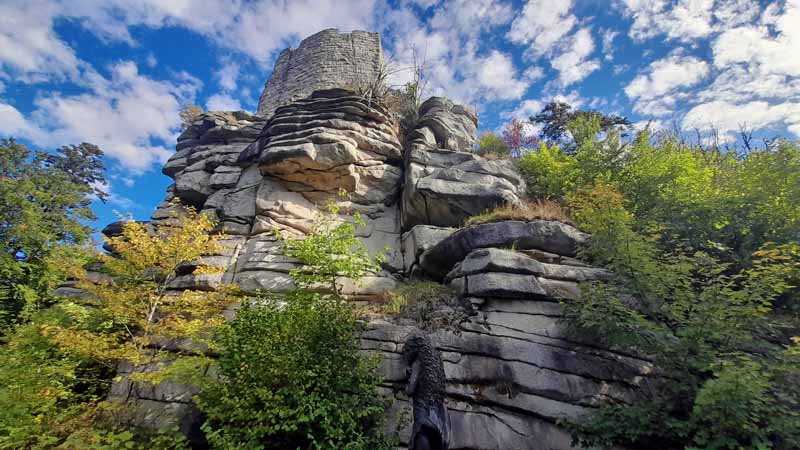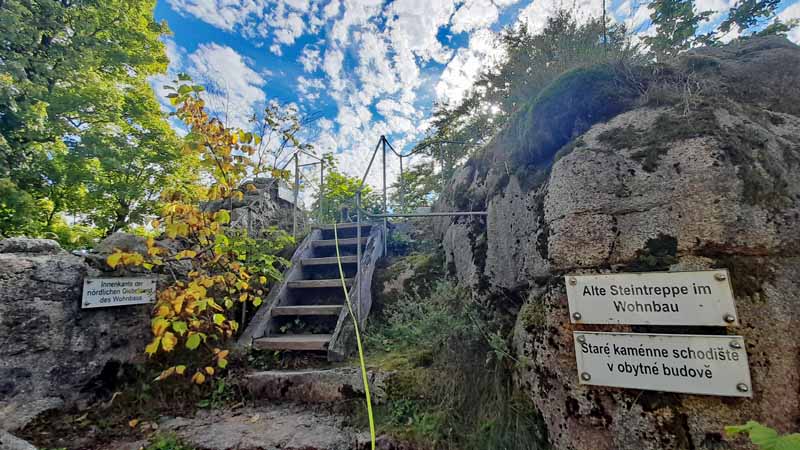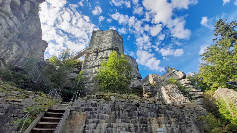 Und damit Besucher die wunderschön sanierte Anlage auch in Zukunft gefahrlos und bequem bestaunen können, baute man 2001 dann die sogenannte Steiganlage ein. Dabei wurden hölzerne Treppen mit vorhandenen, in den Stein geschlagenen Stufen, kombiniert. Als letzter und finaler Part stand dann noch der Bergfried selbst auf dem Programm. Er wurde um ganze drei Meter erhöht und mit einer Plattform ausgestattet, die über eine Treppe erreichbar ist.