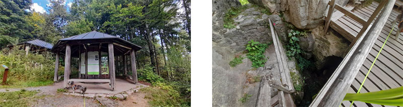 Wenn an der Ruine Weißenstein angekommen sind, liegt auf der rechten Seite der Infopavillon. Der Weg zum Oberpfalzturm geht an dieser Stelle nach rechts ab und führt am Pavillon und der Rasthütte vorbei wieder in den Wald. Schon bald wird der Weg zu einem schmalen, steinigen und etwas unwirtlichen Pfad, den es ein gutes Stück emporzuwandern gilt, bevor wir oben angekommen sind und sich der Weg wieder verbreitert und nun flach und bequem an der Dreifaltigkeitskapelle, dem Schlossfelsen (nicht ausgeschildert und leicht zu übersehen) bis zum Oberpfalzturm kommen.