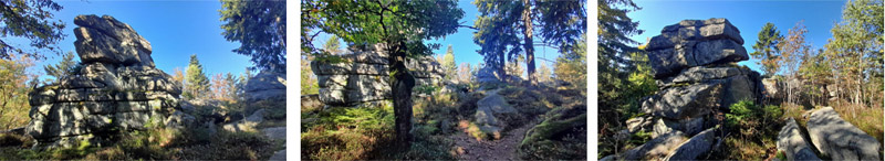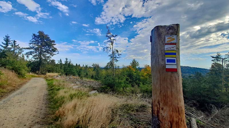 An der Kreuzung hinter dem Oberpfalzturm folgen wir weiter der Markierung Fränkischer Gebirgsweg geradeaus (leicht links). Der Weg wird schmaler, fällt nun leicht ab und ist wieder von Granitplatten und Baumwurzeln durchzogen. An der T-Kreuzung biegen wir nach rechts ab und wandern auf dem breiteren Weg an der nächsten Kreuzung nach rechts (Fränkischer Gebirgsweg).