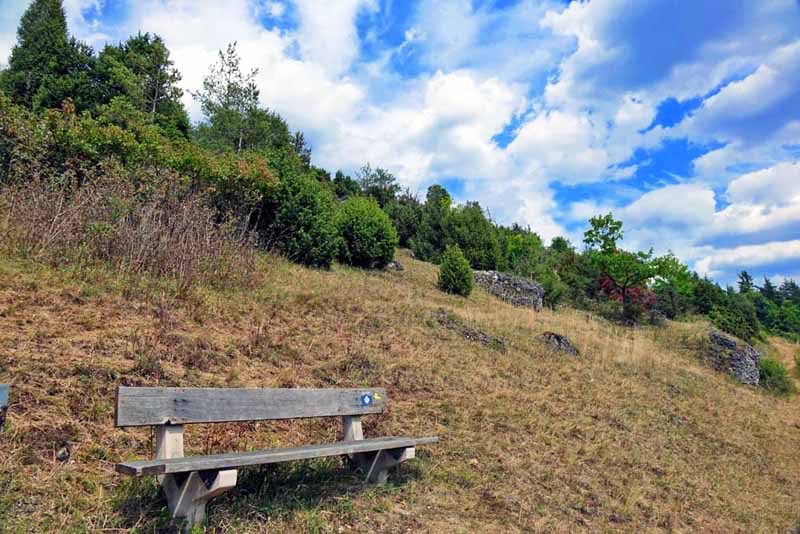 Rechts hinter der Kreuzung liegt gleich eine alte Abbruchkante eines Steinbruchs, nach der ich in den Wald eintauche. Langsam wird es richtig heiß und die Sonne brennt gnadenlos auf mich herab. Da kommt ein wenig Schatten gerade wie gerufen. Ich bin wirklich froh, dass ich mich nur für leichtes Gepäck entschieden habe. Der Weg steigt stetig an, bringt mich aber nicht sonderlich aus der Puste – allerdings ordentlich ins Schwitzen. Im Waldstück zweigt der Wacholderwanderweg das eine oder andere Mal ab, ist aber gut beschildert.