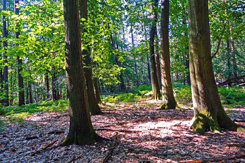Natürlich gibt es im Nationalpark Müritz auch noch Überreste menschlicher Eingriffe in die Natur. Zu Beginn des Wald-Erlebnis-Pfades erkennt man sie noch gut: Fichtenwälder. Doch wenn man genauer hinsieht, erkennt man schon ihren Untergang. Auf dem Waldboden spießen überall andere Baumarten. Vor allem Eichen. Und die kommen gleich in drei verschiedenen Varianten vor. Um sie voneinander unterscheiden zu können, braucht man schon ein geübtes Auge.