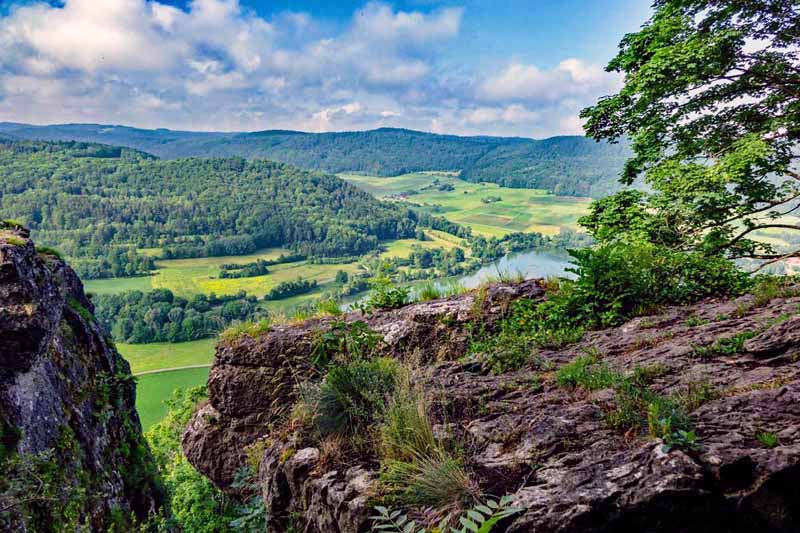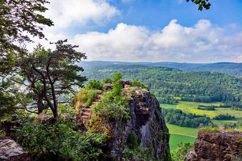 Wir starten unsere Tour auf dem Wanderparkplatz Reckenberg und folgen der Markierung Rotpunkt (Peter-Schoener-Weg) bis zum Aussichtspunkt oberhalb des Hohlen Felsens an der Abbruchkante der Houbirg. Von hier aus geht es ein kleines Stückchen über Stufen wieder zurück, dann steil den Hang hinab zur Naturbrücke am Hohlen Fels.