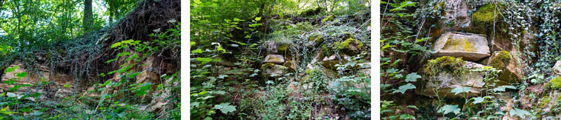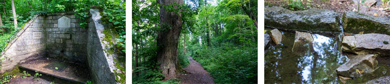 Wieder im Wald treffen wir bald auf eine mit Steinen umrahmte Quelle, hinter der der geologische Lehrpfad weiter geradeaus führt. Lasst euch nicht von dem überwucherten Weg irritieren, schon nach wenigen Metern treffen wir auf die erste Infotafel. Wir folgen dem Geopfad, der uns auf teilweise abenteuerlichen Windungen zu einer Sandsteinschlucht, in deren Kurve es steil den Berg hinauf geht. Oben halten wir uns auf dem breiten Waldweg nach recht, an der nächsten Abzweigung links.