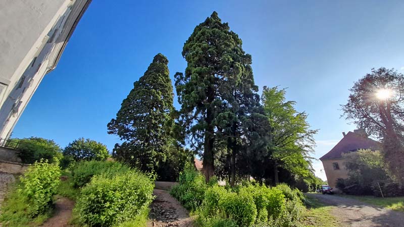 Dort, wo die Weinbergstraße eine Linkskurve beschreibt, biegen wir nach rechts in den Wald ab und gehen hinter dem Schloss den Hang empor. Oben angekommen halten wir uns an der Straße rechts und kommen wieder am Parkplatz an, von dem wir gestartet sind.
