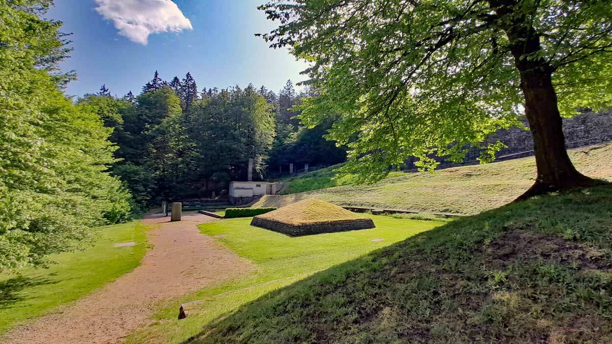 Er bringt uns zurück zur Gaisweiher Straße. Wir biegen nach rechts ab, und gehen weiter geradeaus über die Birkenstraße Richtung Parkplatz zurück. Vor dem Parkplatz biegen wir (der Birkenstraße folgend) nach rechts ab und kommen direkt zum Eingang der KZ-Gedenkstätte Flossenbürg. Diese kann kostenlos besucht werden und hat täglich geöffnet. Auf dem Rückweg müssen wir uns vor dem Eingang leicht rechts halten und dann nach links auf den Parkplatz abbiegen.