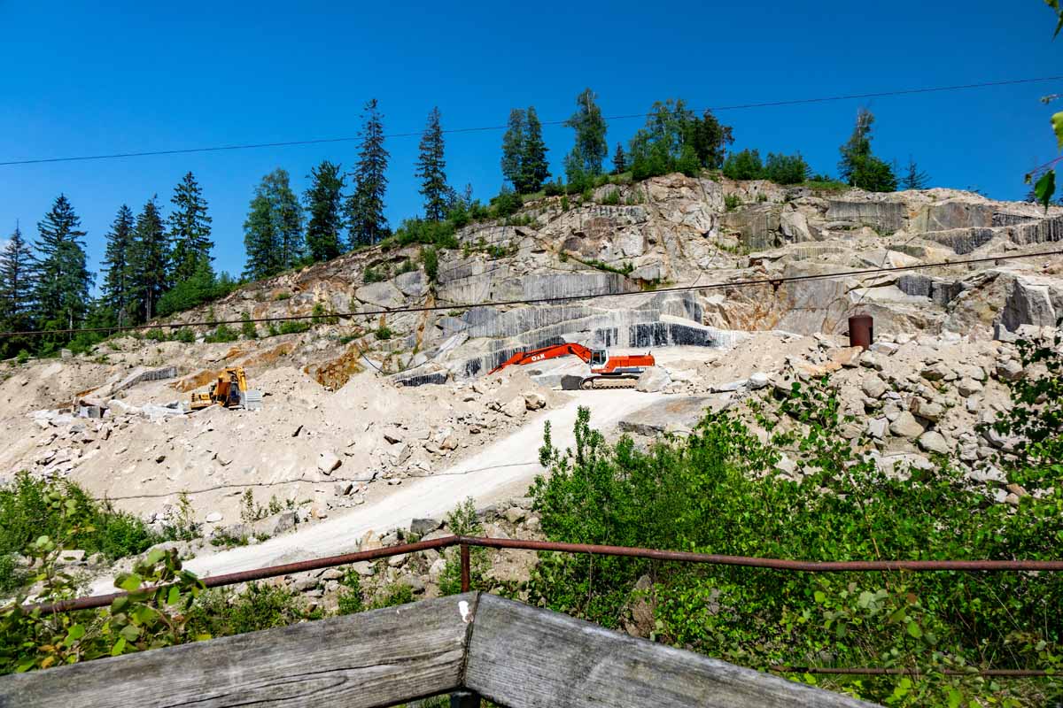 Auf der linken Seite ist das braun leuchtende Wasser des Burgweihers zu sehen, dahinter der Steinbruch. Gegenüber in dem Gebäude, das ein wenig wie ein Bunker wirkt, befindet sie eine Infostelle des Geoparks Bayern-Böhmen mit Ausstellung und Filmmaterial über das Thema Mensch und Granit.