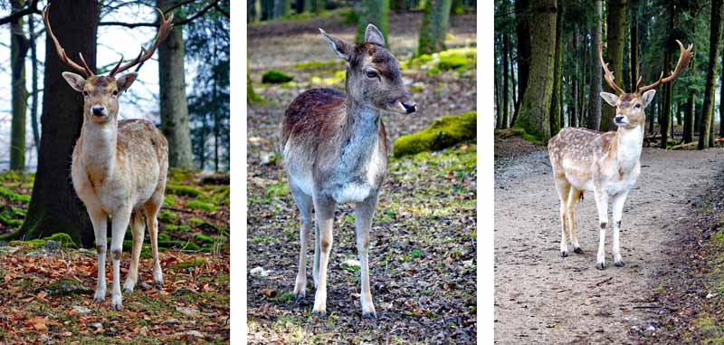 Und wer bislang immer Schwierigkeiten damit hatte, Dam- und Rotwild auseinander zu halten, kann sich von den deutlichen Unterschieden überzeugen. Damwild ist nicht nur sehr viel kleiner als Rotwild, das Fell heller braun gefärbt und deutlich gepunktet. Auch die Geweihstangen laufen nicht spitz zu, sondern bilden im oberen Teil eine Schaufel mit mehr oder weniger ausgeprägten Randsprossen.